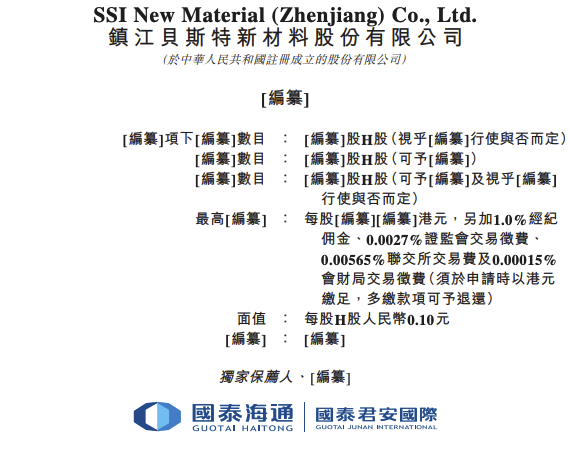 (於中華人民共和國註冊成立的股份有限公司) 【繼臺] 据港交所文件,1月12目,镇江贝斯特新材料股份有限公司向港交所递交上市申请书,独家保荐人为国 泰海通。 SSI New Material (Zhenjiang) Co., Ltd. 鎮 江 貝 斯 特 新 材 料 股 份 有 限 公 司 獨家保薦人·[編纂] 或添周期 國泰君安國際 「編纂]項下[編纂]數目 : [編纂]股H股(視乎[編纂]行使與否而定) [編纂]數目 : [編纂]股H股(可予[編纂]) 「編纂]數目 : [編纂]股H股(可予[編纂]及視乎[編纂] 行使與否而定) 最高[編纂] : 每股[編纂][編纂]港元,另加1.0%經紀 佣金、0.0027%證監會交易徵費、 0.00565%聯交所交易費及0.00015% 會財局交易徵費(須於申請時以港元 繳足,多繳款項可予退還) 面值 : 每股H股人民幣0.10元 [編纂] : [編纂] ...
