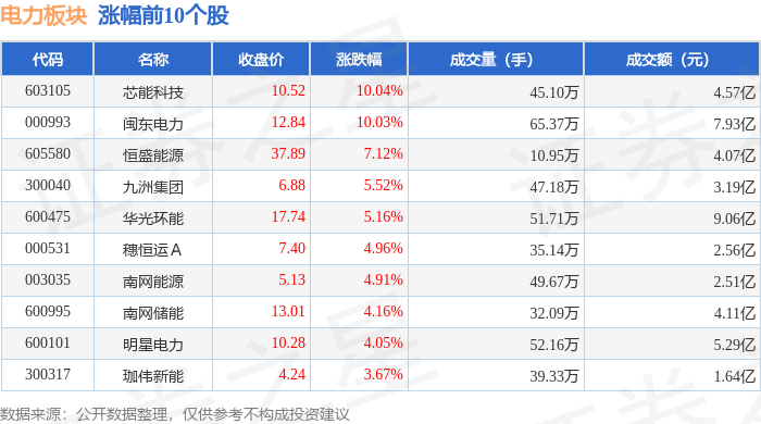 | 代码 | 名称 | 收盘价 | 涨跌幅 | 成交量(手) | 成交额(元) | | | --- | --- | --- | --- | --- | --- | --- | | 000809 | 和展能源 | 3.73 | 10.03% | 53.33万 | | 1.92亿 | | 000620 | 盈新发展 | 3.30 | 10.00% | 571.32万 | | 18.36亿 | | 600185 | 珠兔集团 | 6.91 | 5.66% | 131.56万 | | 9.13亿 | | 000736 | *ST中地 | 6.49 | 5.02% | 1.60万 | | 1039.76万 | | 000609 | ST中迪 | 8.39 | 5.01% | 1.71万 | | 1437.89万 | | 600510 | 黑牡丹 | 8.85 | 4.24% | 18.51万 | | 1.62亿 | | 000863 | 三湘印象 | 4.08 | 4.08% | 36.80万 | | 1.48亿 | | 000573 | 粤宏远 A | 4.57 | 3.86% | 56.56万 | | 2.59亿 ...