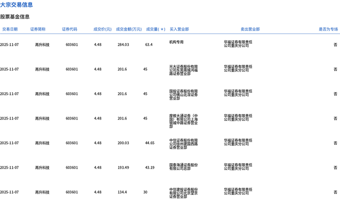 11月7日,再升科技大宗交易成交316.24万股,成交额1416.75万元,占当日总成交额的4.49%,成交价 4.48元,较市场收盘价5.01元折价10.58%。 | 交易日期 | 证券简称 | 证券代码 | | | 成交价(元) 成交金额(万元) 成交量(*) 买入营业部 | | 类出营业部 | 是否为专场 | | --- | --- | --- | --- | --- | --- | --- | --- | --- | | 2025-11-07 | 再升科技 | 603601 | 4.48 | 284.03 | 63.4 | 机构专用 | 公司需要有限责任 | KA | | 2025-11-07 | 再升科技 | 603601 | 4.48 | 201.6 | વર્ત | 我的意義的意義 | 公司 2017年 | Ka | | 2025-11-07 | 周升科技 | 603601 | 4.48 | 201.6 | 45 | - - | 公司需要有限责任 | 집 | | 2025-11-07 | 再升科技 | 603601 | 4.48 | 201.6 | વર્ત | 国) 年度公司 参考 | 2 2 ...