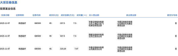| 交易日期 | 证券简称 | 证券代码 | | | 成交价(元) 成交金额(万元) 成交量( *) 买入营业部 | | 卖出营业部 | 是否为专场 | | --- | --- | --- | --- | --- | --- | --- | --- | --- | | 2025-11-07 | 伟思医疗 | 688580 | 45 | 337.5 | 7.5 | | ្នកម្រុះគេនេ | Ka | | 2025-11-07 | 伟思医疗 | 688580 | વર્ત | 337.5 | 7.5 | 圆筒连续劈纹盘甲 | 茶園區發生成點區 | KI | | 2025-11-07 | 伟思医疗 | 688580 | વર્ત | 318.29 | 7.07 | 去看需要努您有限 | 去高清多笑见喜野 | Ka | 11月7日,伟思医疗大宗交易成交22.07万股,成交额993.29万元,占当日总成交额的11.4%,成交价45 元,较市场收盘价49.22元折价8.57%。 ...