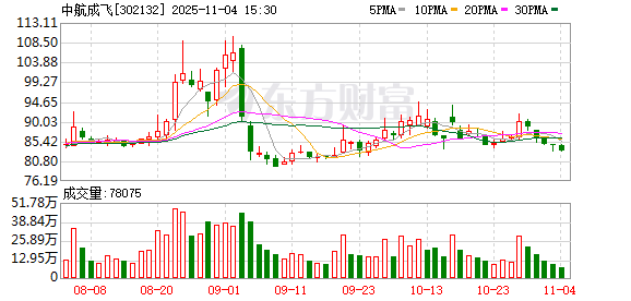 据天眼查APP显示,中航成飞股份有限公司成立于2002年12月25日,注册资本267209.1376万人民币。 (数据宝) 11月4日中航成飞大宗交易一览 中航成飞11月4日大宗交易平台出现一笔成交,成交量24.60万股,成交金额2259.51万元,大宗交易成交 价为91.85元,相对今日收盘价溢价10.30%。该笔交易的买方营业部为平安证券股份有限公司北京北土 城西路证券营业部,卖方营业部为平安证券股份有限公司上海临港新片区分公司。 进一步统计,近3个月内该股累计发生2笔大宗交易,合计成交金额为3485.84万元。 证券时报·数据宝统计显示,中航成飞今日收盘价为83.27元,下跌1.70%,日换手率为1.33%,成交额为 6.53亿元,全天主力资金净流出8637.61万元,近5日该股累计下跌7.47%,近5日资金合计净流出9.50亿 元。 两融数据显示,该股最新融资余额为15.17亿元,近5日减少1.05亿元,降幅为6.49%。 | 成交量 | 成交金额 | 成交价 | 相对当日收盘 | | | | --- | --- | --- | --- | --- | --- | | (万 | (万元) | 格 | ...