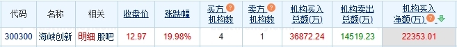 (责任编辑:马欣) | 代理 | 名称 | 相关 | 版盘价 | 张跌幅 | 买方 3 卖方 0 | | 机构买入 | 机构园出 | 机构买入 | | --- | --- | --- | --- | --- | --- | --- | --- | --- | --- | | | | | | | 机构数 | 机构改 | 鳥额(万) | 鳥额(万) | 净额(万) 3 � | | 300300 | | | 12.97 | 19.98% | | | 36872.24 | 14519.23 | 22353.01 | | 买入金额最大的前5名 | | | | | | | | | --- | --- | --- | --- | --- | --- | --- | --- | | 序号 | 交易营业部名称 | | | 买入金额(万) | 占总成交比例 | 卖出金额(万) | 占总成交比例 | | 1 | 机构专用 | 1628次 42.69% | 2 | 15593.20 | 4.47% | 8447.56 | 2.42% | | 2 | 机构专用 | 1628次 42.69% | ▲ | 10101.54 | 2.90% ...