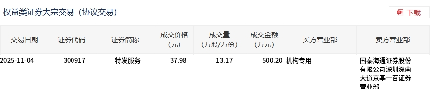 | 交易日期 | 证券代码 | 证券简称 | 成交价格 (元) | 成交量 (万股/万份) | 成交金额 (万元) | 买方营业部 | 卖方营业部 | | --- | --- | --- | --- | --- | --- | --- | --- | | 2025-11-04 | 300917 | 特发服务 | 37.98 | 13.17 | 500.20 机构专用 | | 国泰海通证券股份 | | | | | | | | | 有限公司深圳深南 | | | | | | | | | 大道京基一百证券 | | | | | | | | | 营业部 | 11月4日,特发服务大宗交易成交13.17万股,成交额500.2万元,占当日总成交额的3.76%,成交价37.98元,较市场收盘价 40.75元折价6.8%。 ...