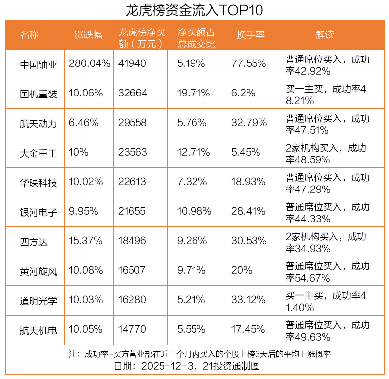 12月3日,上证指数下跌0.51%,深证成指下跌0.78%,创业板指下跌1.12%。盘后龙虎榜数据显示,共有51只个股 因当日异动登上龙虎榜,资金净流入最多的是中国铀业(001280.SZ),达4.19亿元。 据21投资通智能监测,26只个股龙虎榜出现了机构的身影,北向资金参与龙虎榜中的个股共涉及19只。 4.19亿资金抢筹中国铀业,3.62亿资金出逃平潭发展 51只上榜的龙虎榜个股中,19只个股被净买入,32只个股被净卖出。其中,资金净买入最多的是中国铀业,达 4.19亿元,占总成交金额的5.19%。中国铀业当日收盘上涨280.04%,换手率为77.55%。 | 名称 | 涨跌幅 | 龙虎榜净买 | 净买额占 | 换手率 | | --- | --- | --- | --- | --- | | | | 额(万元 | 总成交比 | | | 平潭发展 | -9.91% | -36188 | 4.12% | 37.51% | | 通宇通讯 | -2.54% | -35425 | 5.96% | 59.65% | | 南网数字 | -3.49% | -20747 | 10.07% | 38.46% | | 赛微电子 ...