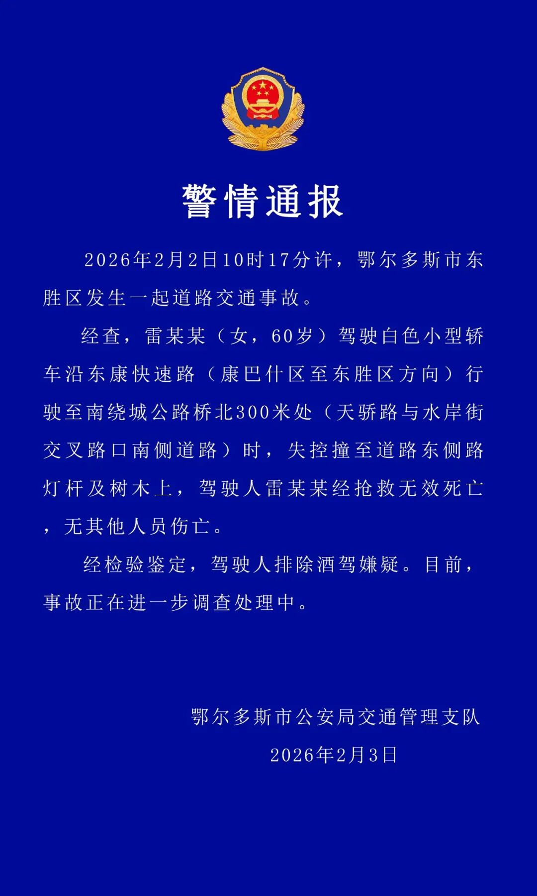 鄂尔多斯警方通报一汽车失控撞上路灯杆及树木:驾驶人经抢救无效死亡,排除酒驾嫌疑