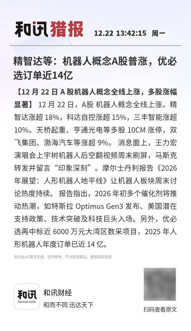 【12 月 22 日 A 股机器人概念全线上涨,多股涨幅显著】12 月 22 日,A股 机器人概念全线上涨。精智 达涨超 18%,科达自控涨超 15%,三丰智能涨超 10%。天桥起重、亨通光电等多股 10CM 涨停,双飞 集团、渤海汽车等涨超 9%。消息面上,王力宏演唱会上宇树机器人后空翻视频周末刷屏,马斯克转发 并留言"印象深刻"。摩尔士丹利报告《2026 年展望:人形机器人地平线》让机器人板块周末讨论热度 持续。报告指出,2026 年初多个催化剂将推动热潮,如特斯拉 Optimus Gen3 发布、美国潜在支持政 策、技术突破及科技巨头入场。另外,优必选再中标近 6000 万元大湾区数采项目,2025 年人形机器人 年度订单已近 14 亿。 本文由 AI 算法生成,仅作参考,不涉投资建议,使用风险自担 本文由 Al 算法生成,仅作参考,不涉投资建议,使用风险自担 和讯财经 hexun.cor 和而不同 迅达天下 扫码查看原文 ...