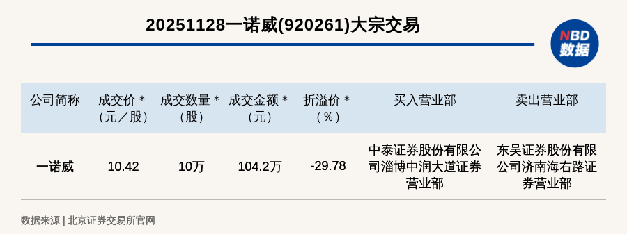 (记者 曾健辉) 免责声明:本文内容与数据仅供参考,不构成投资建议,使用前核实。据此操作,风险自担。 每日经济新闻 每经讯,2025年11月28日,北交所上市公司一诺威(920261,收盘价:14.84元)发生一笔大宗交易,成交价10.42元/股,成交数 量10万股,成交金额104.2万元,折价29.78%。买入营业部是中泰证券股份有限公司淄博中润大道证券营业部,卖出营业部是东 吴证券股份有限公司济南海右路证券营业部。 ...