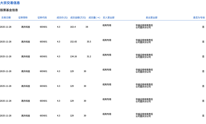 | 股票基金信息 | | --- | | 交易日期 证券简称 | | 证券代码 | 成交价(元) 成交金额(万元) 成交量(*) 买入营业部 | | 卖出营业部 是否为专场 | | --- | --- | --- | --- | --- | --- | | 025-11-28 | 华夏幸福 | 600340 | 2.2 66 30 | 公司員系選男契盟 | 态量量蒸暖雾臭塑 ко | 11月28日,华夏幸福大宗交易成交30万股,成交额66万元,占当日总成交额的0.08%,成交价2.2元,较 市场收盘价2.4元折价8.33%。 ...