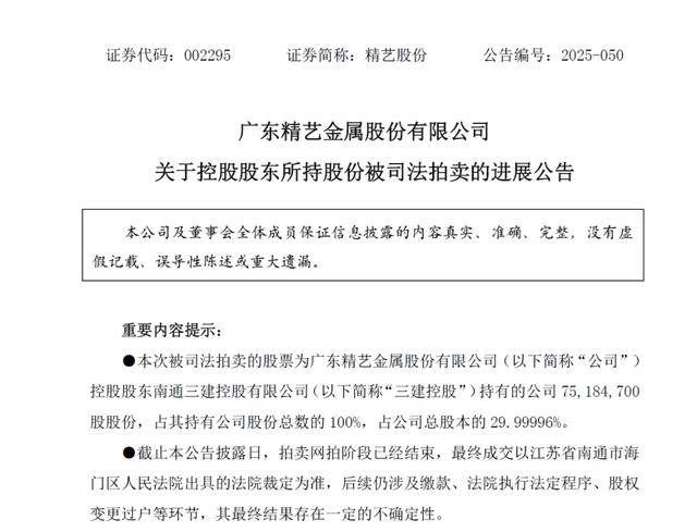 10月11日,根据精艺股份公告信息,眉山东坡区国资以10.86亿元通过公开竞买获得公司29.9%股份,交 易完成后公司实控人将变更为眉山市东坡区国资局。 标的处于传统行业但基本面稳健 受益于光伏组件、储能系统等新能源产业的铜材需求快速增长,公司新能源相关产品营收占比逐步提 升。另外,新能源汽车用铜超微线、光伏用铜箔等产品已通过宁德时代、比亚迪等头部企业认证,相关 订单也在持续增长。 2024年,公司实现营业收入37.54亿元,同比增长38.43%。全年归母净利润达2770万元,同比增长 15.57%。尽管铜加工行业同质化竞争加剧导致毛利率维持在3.38%的行业中等水平,但营收规模的快速 扩张,仍然带来了一定的利润空间。 资产结构方面,截至2024年末公司资产总计20.88亿元,负债合计7.32亿元,资产负债率35.03%,财务 杠杆处于安全区间。 现金流方面,2024年末公司现金及现金等价物净增加额为1.58亿元,年末现金余额达到3.53亿元。其 中,经营活动产生的现金流量净额为1.16亿元,同比增长36.23%。现金流状况较为健康。 竞买激烈,32万人围观,77次出价 原控股股东南通三建控股有限公司持有精艺 ...