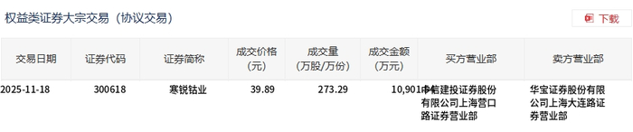 | 权益类证券大宗交易(协议交易) | | | | | | | | 团 下载 | | --- | --- | --- | --- | --- | --- | --- | --- | --- | | 交易日期 | 证券代码 | 证券简称 | 成交价格 | 成交量 | 成交金额 | 买方营业部 | 卖方营业部 | | | | | | (元) | (万股/万份) | (万元) | | | | | 2025-11-18 | 300618 | 寒锐铭业 | 39.89 | 273.29 | | 10,901虚信建投证券股份 | 华宝证券股份有限 | | | | | | | | | 有限公司上海营口 | 公司上海大连路证 | | 11月18日,寒锐钴业大宗交易成交273.29万股,成交额1.09亿元,占当日总成交额的12.75%,成交价 39.89元,较市场收盘价47.78元折价16.51%。 ...
