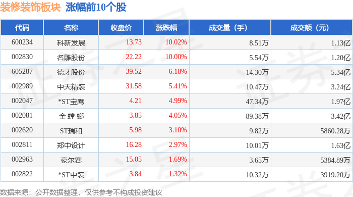 证券之星消息,1月16日装修装饰板块较上一交易日上涨0.53%,科新发展领涨。当日上证指数报收于 4101.91,下跌0.26%。深证成指报收于14281.08,下跌0.18%。装修装饰板块个股涨跌见下表: | 代码 | 名称 | 收盘价 | 涨跌幅 | 成交量(手) | 成交额(元) | | | --- | --- | --- | --- | --- | --- | --- | | 600234 | 科新发展 | 13.73 | 10.02% | 8.51万 | | 1.13亿 | | 002830 | 名雕股份 | 22.22 | 10.00% | 5.54万 | | 1.20亿 | | 605287 | 德才股份 | 39.52 | 6.18% | 14.30万 | | 5.34亿 | | 002989 | 中天精装 | 31.58 | 5.41% | 10.47万 | | 3.24亿 | | 002047 | *ST宝鹰 | 4.21 | 4.99% | 47.34万 | | 1.97亿 | | 002081 | 金螳螂 | 3.85 | 4.05% | 89.38万 | | 3.42亿 | | 00 ...