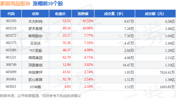 证券之星消息,1月16日家居用品板块较上一交易日下跌0.28%,美克家居领跌。当日上证指数报收于 4101.91,下跌0.26%。深证成指报收于14281.08,下跌0.18%。家居用品板块个股涨跌见下表: | 代码 | 名称 | 收盘价 | 涨跌幅 | 成交量(手) | 成交额(元) | | | --- | --- | --- | --- | --- | --- | --- | | 301595 | 太力科技 | 53.55 | 10.53% | 8.67万 | | 4.58亿 | | 603216 | 梦天家居 | 49.16 | 10.00% | 7.28万 | | 3.48亿 | | 603272 | 联翔股份 | 23.17 | 7.77% | 7.39万 | | 269 T | | 301575 | 艾芬达 | 55.36 | 7.16% | 4.47万 | | 2.44亿 | | 603389 | *ST亚振 | 48.37 | 4.99% | 2.68万 | | 1.28亿 | | 001221 | 悍高集团 | 62.70 | 4.71% | 4.08万 | | 2.51亿 | | 3007 ...