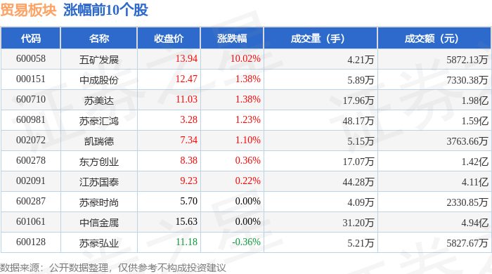 | 代码 | 名称 | 收盘价 | 涨跌幅 | 成交量(手) | 成交额(元) | | --- | --- | --- | --- | --- | --- | | 600608 | *ST户科 | 3.42 | -4.74% | 5.33万 | 1834.05万 | | 002183 | 怡亚通 | 667 | -1.58% | 89.22万 | 4.46 Z | | 600250 | 南京商旅 | 11.83 | -1.50% | 23.35万 | 1 2.75亿 | | 600128 | 示索弘业 | 11.18 | -0.36% | 5.21万 | 5827.67万 | | 600287 | 亦蒙时尚 | 5.70 | 0.00% | 4.09万 | 2330.85万 | | 601061 | 中信金属 | 15.63 | 0.00% | 31.20万 | 4.94亿 | | 002091 | 江苏国泰 | 9.23 | 0.22% | 44.28万 | 4.11亿 | | 600278 | 东方创业 | 8.38 | 0.36% | 17.07万 | 1.42亿 | | 002072 | 凯瑞德 | ...