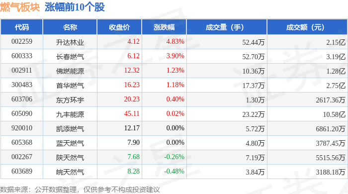 证券之星消息,1月16日燃气板块较上一交易日下跌1.23%,德龙汇能领跌。当日上证指数报收于 4101.91,下跌0.26%。深证成指报收于14281.08,下跌0.18%。燃气板块个股涨跌见下表: | 代码 | 名称 | 收盘价 | 涨跌幅 | 成交量(手) | 成交额(元) | | | --- | --- | --- | --- | --- | --- | --- | | 002259 | 升达林业 | 4.12 | 4.83% | 52.44万 | | 2.15 Z | | 600333 | 长春燃气 | 6.12 | 3.90% | 52.70万 | | 3.19亿 | | 002911 | 佛燃能源 | 12.32 | 1.23% | 10.36万 | | 1.28亿 | | 300483 | 首华燃气 | 16.23 | 1.18% | 17.37万 | | 2.75亿 | | 603706 | 东方坏宇 | 20.23 | 0.40% | 1.30万 | 2617.36万 | | | 605090 | 九丰能源 | 45.11 | 0.02% | 23.22万 | | 10.58亿 | | 92 ...