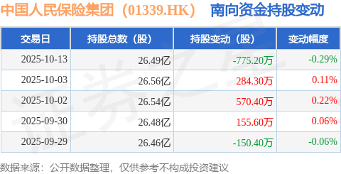 证券之星消息,10月13日南向资金减持775.2万股中国人民保险集团(01339.HK)。近5个交易日中,获 南向资金增持的有3天,累计净增持84.7万股。近20个交易日中,获南向资金增持的有13天,累计净增 持4523.9万股。截至目前,南向资金持有中国人民保险集团(01339.HK)26.49亿股,占公司已发行普 通股的30.34%。 | 交易日 | 持股总数(股) | 持股变动(股) | 变动幅度 | | --- | --- | --- | --- | | 2025-10-13 | 26.49亿 | -775.20万 | -0.29% | | 2025-10-03 | 26.56亿 | 284.30万 | 0.11% | | 2025-10-02 | 26.54亿 | 570.40万 | 0.22% | | 2025-09-30 | 26.48亿 | 155.60万 | 0.06% | | 2025-09-29 | 26.46亿 | -150.40万 | -0.06% | 中国人民保险集团股份有限公司是一家主要提供保险产品的控股公司。该公司及其子公司主要从事财产 保险、健康保险、人寿保险、再保险、香港保 ...