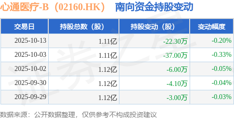 心通医疗-B(02160.HK):10月13日南向资金减持22.3万股