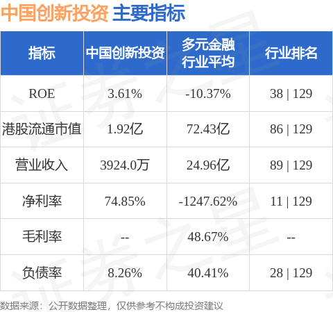 中国创新投资(01217.HK)公布,于2025年9月30日,公司每股股份的未经审核资产净值约为 0.047 港 元。 | 指标 | 中国创新投资 | 多元金融 行业平均 | 行业排名 | | --- | --- | --- | --- | | ROE | 3.61% | -10.37% | 38 129 | | 港股流通市值 | 1.92亿 | 72.43 乙 | 86 129 | | 营业收入 | 3924.0万 | 24.96亿 | 89 129 | | 净利率 | 74.85% | -1247.62% | 11 129 | | 毛利率 | | 48.67% | | | 负债率 | 8.26% | 40.41% | 28 129 | 以上内容为证券之星据公开信息整理,由AI算法生成(网信算备310104345710301240019号),不构成 投资建议。 截至2025年10月13日收盘,中国创新投资(01217.HK)报收于0.01港元,与上一交易日持平,成交量 9707.2万股,成交额139.23万港元。投行对该股关注度不高,90天内无投行对其给出评级。 中国创新投资港股市值1.92亿港元,在多元金 ...