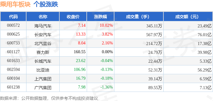 证券之星消息,10月16日乘用车板块较上一交易日上涨0.36%,海马汽车领涨。当日上证指数报收于 3916.23,上涨0.1%。深证成指报收于13086.41,下跌0.25%。乘用车板块个股涨跌见下表: | 代码 | 名称 | 收盘价 | 涨跌幅 | 成交量(手) | 成交额(元) | | --- | --- | --- | --- | --- | --- | | 000572 | 出版中集 | 7.14 | 10.02% | 345.11万 | 23.49 Z | | 000625 | 长安汽车 | 13.33 | 3.82% | 567.97万 | 76.01亿 | | 600733 | 北汽蓝谷 | 8.04 | 2.16% | 214.72万 | 17.38 Z | | 601127 | 審力斯 | 160.55 | 0.00% | 24.79万 | 39.98亿 | | 601633 | 长城汽车 | 23.62 | -0.04% | 22.44万 | 5.33亿 | | 002594 | 比亚迪 | 106.96 | -0.13% | 52.31万 | 56.29亿 | | 600104 | 上汽 ...