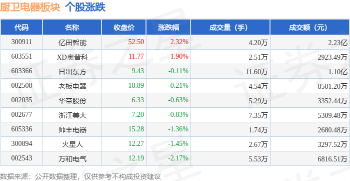 证券之星消息,10月16日厨卫电器板块较上一交易日下跌0.33%,万和电气领跌。当日上证指数报收于 3916.23,上涨0.1%。深证成指报收于13086.41,下跌0.25%。厨卫电器板块个股涨跌见下表: | 代码 | 名称 | 主力净流入(元) | 主力净占比 游资净流入 (元) | | 游资净占比 散户净流入 (元) | | 散户净占比 | | --- | --- | --- | --- | --- | --- | --- | --- | | 300911 | 亿田智能 | > 1512.73万 | 6.79% | 337.73万 | 1.52% | -1850.46万 | -8.31% | | 603551 | XD奧普科 | -35.30万 | -1.21% | 332.76万 | 11.38% | -297.45万 | -10.17% | | 002508 | 老板电器 | -40.61万 | -0.47% | -129.21万 | -1.51% | 169.82万 | 1.98% | | 300894 | 火星人 | -160.54万 | -4.87% | 53.81万 | 1.63% | 10 ...