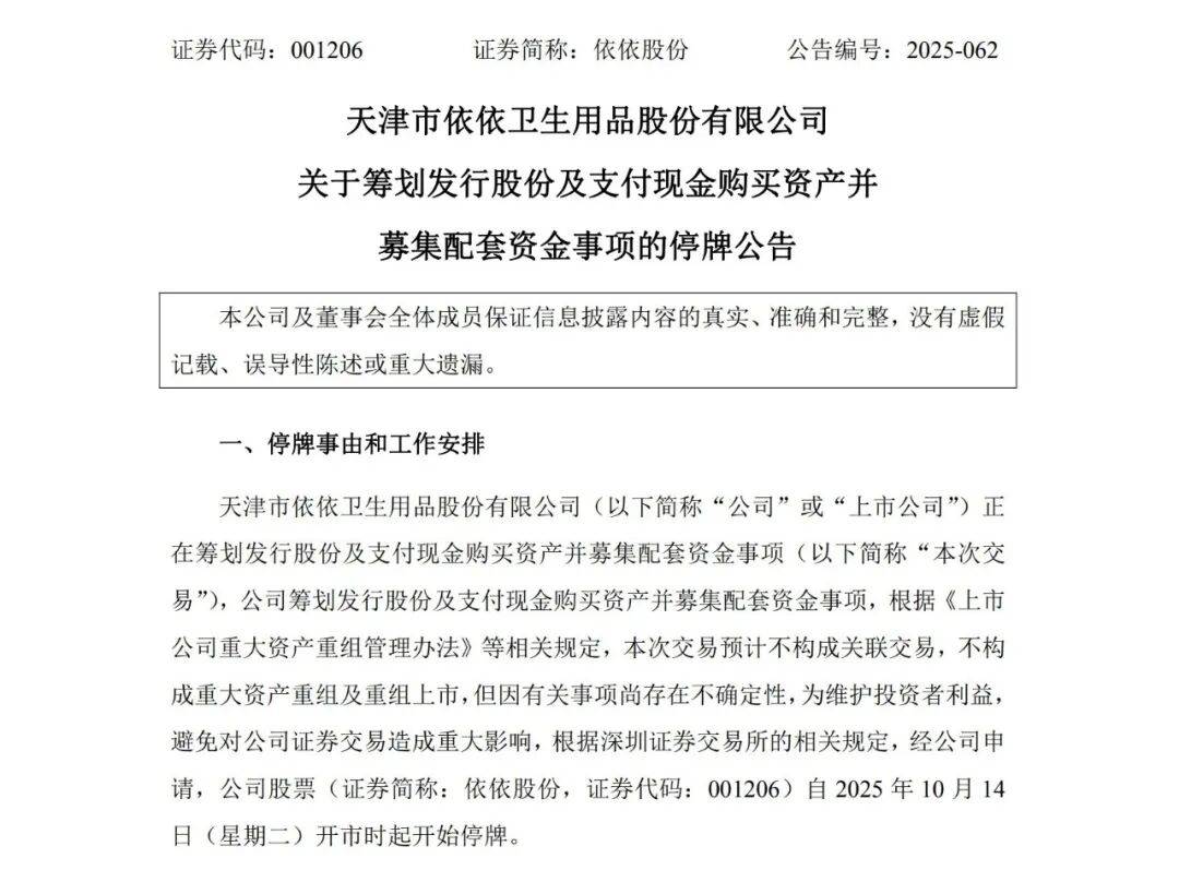 10月13日晚间,宠物卫生护理用品龙头公司依依股份(001206)发布公告称,正在筹划发行股份及支付现金购买资产并募集配套资金事项,本次交易标的 为杭州高爷家有好多猫宠物食品有限责任公司。因有关事项尚存在不确定性,为维护投资者利益,避免对公司证券交易造成重大影响,经公司申请,公司 股票自2025年10月14日(星期二)开市时起开始停牌。 截至公告日,公司已与本次交易的主要交易对方签署《发行股份及支付现金购买资产意向协议》,初步达成购买资产意向。 记者关注到,"高爷家"品牌在电商平台拥有较高知名度,主要销售猫粮产品。以天猫平台为例,高爷家天猫旗舰店拥有34.3万粉丝,天猫旗舰店背后的企 业为杭州望妙生物科技有限责任公司,该公司为杭州高爷家有好多猫宠物食品有限责任公司的全资子公司。据企查查,杭州望妙生物科技有限责任公司已 于2021年进行A轮融资,融资金额5000万元,投资方包括金鼎投资、众晖资本。 | ﺑ 宠物食品制造商 | | | | --- | --- | --- | | 所属企业:杭州望妙生物科技有限责任公司 | 累计融资次数:1 | 电话:0571-88795521 | | 成立日期:2018-12-1 ...