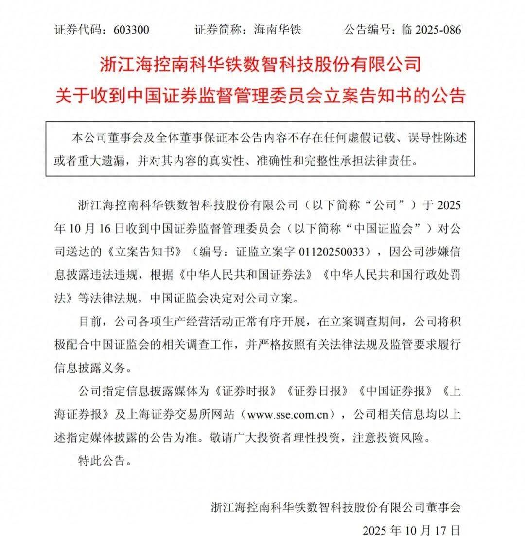 10月16日晚间,浙江海控南科华铁数智科技股份有限公司(简称"海南华铁")发布公告称,公司于当日收到中国证监会的《立案告知书》,因涉嫌信息披 露违法违规,中国证监会决定对公司立案。 公告称,目前,公司各项生产经营活动正常有序开展,将积极配合中国证监会的调查工作,并严格履行信息披露义务。 海南华铁公告。图源:上交所 9月底,海南华铁一笔大单的"告吹",引起了各界的高度关注。 今年3月,海南华铁披露了一份价值36.9亿元的算力订单,其金额相当于公司2024年营业收入的71%,这一重大利好为海南华铁的股价带来多个涨停。 然而,到了9月30日,海南华铁披露称,子公司海南华铁大黄蜂建筑机械设备有限公司与杭州某公司签订的算力服务合同解除,该合同的预计含税总金额 36.9亿元。自始至终,海南华铁都未公布合作方是哪家公司。 消息一出,引发市场震动。9月30日当天,上交所向海南华铁下发监管工作函,就公司重大合同终止相关事项明确监管要求。"十一"假期结束后,海南华 铁的股价连续两个交易日跌停。 据官网介绍,海南华铁是海南省发展控股有限公司控股子公司,位于浙江省杭州市,2008年成立,于2015年5月在上海证券交易所主板上市。 来 ...
