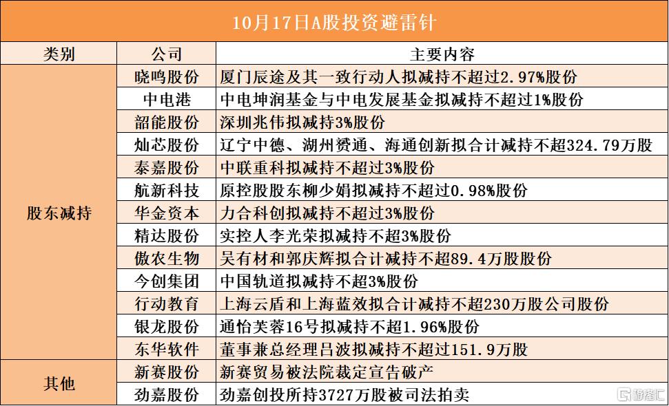 温馨提示:财经最新动态随时看,请关注金投网APP。 | | | 10月17日A股投资避雷针 | | --- | --- | --- | | 类别 | 公司 | 主要内容 | | 股东减持 | 晓鸣股份 | 厦门辰途及其一致行动人拟减持不超过2.97%股份 | | 中甲港 | | 中电坤润基金与中电发展基金拟减持不超过1%股份 | | 深圳兆伟拟减持3%股份 | 韶能股份 | | | 灿恋股份 | | 辽宁中德、湖州旁通、海通创新拟合计减持不超324.79万股 | | 泰嘉股份 | | 中联重科拟减持不超过3%股份 | | 航新科技 | | 原控股股东柳少娟拟减持不超过0.98%股份 | | 华金资本 | | 力合科创拟减持不超过3%股份 | | 精达股份 | | 实控人李光荣拟减持不超3%股份 | | 傲农生物 | | 吴有材和郭庆辉拟合计减持不超89.4万股股份 | | 今创集团 | | 中国轨道拟减持不超3%股份 | | 行动教育 | | 上海云盾和上海蓝效拟合计减持不超230万股公司股份 | | 银龙股份 | | 通怡芙蓉16号拟减持不超1.96%股份 | | 东华软件 | | 董事兼总经理吕波拟减持不 ...