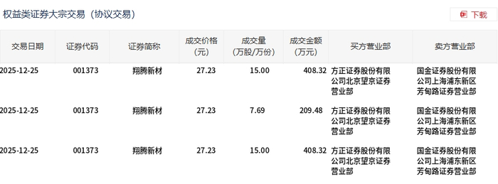 12月25日,翔腾新材大宗交易成交37.69万股,成交额1026.12万元,占当日总成交额的9.36%,成交价 27.23元,较市场收盘价31.14元折价12.56%。 | 权益类证券大宗交易(协议交易) | | | | | | 团 下载 | | --- | --- | --- | --- | --- | --- | --- | | 交易日期 | 证券代码 | 证券简称 | 成交价格 | 成交量 | 成交全额 买方营业部 | 卖方营业部 | | | | | (元) | (万股/万份) | (万元) | | | 2025-12-25 | 001373 | 翔感新材 | 27.23 | 15.00 | 408.32 方正证券股份有限 | 国金证券股份有限 | | | | | | | 公司北京里京证券 | 公司上海浦东新区 | | | | | | | 营业部 | 芳甸路证券营业部 | | 2025-12-25 | 001373 | 関勝新材 | 27.23 | 7.69 | 209.48 方正证券股份有限 | 国金证券股份有限 | | | | | | | 公司北京望京证券 | 公司上海浦东新区 | | | | | ...