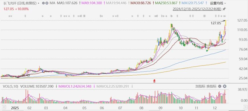 有分析称行业需求趋势向好。中信建投报告指出,今年三季度以来,中国市场光纤价格持续上涨,反应需求向好、整体供 应偏紧。海外需求旺盛,出口表现强劲,也反映了全球光纤光缆市场的旺盛需求。考虑到全球光学模组需求量在2026年仍 将大幅增长,则对应光纤需求也将随之增长。 股票频道更多独家策划、专家专栏,免费查阅>> 12月22日,延续近日强势,长飞光纤(601869.SH)今日涨停,报127.05元,股价创历史新高;H股再度大涨13%至58.5港元, 股价创9月底以来新高。 责任编辑:栎树 ...