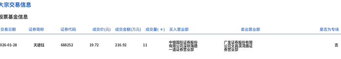 天德钰今日大宗交易折价成交11万股,成交额216.92万元