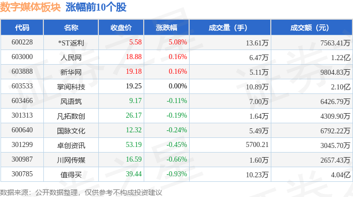 证券之星消息,12月26日数字媒体板块较上一交易日下跌0.5%,视觉中国领跌。当日上证指数报收于 3963.68,上涨0.1%。深证成指报收于13603.89,上涨0.54%。数字媒体板块个股涨跌见下表: 从资金流向上来看,当日数字媒体板块主力资金净流出2.31亿元,游资资金净流出1750.53万元,散户资 金净流入2.49亿元。数字媒体板块个股资金流向见下表: | 代码 | 名称 | 主力净流入(元) | 主力净占比 游资净流入(元) | | 游资净占比 散户净流入(元) | | 散户净占比 | | --- | --- | --- | --- | --- | --- | --- | --- | | 600228 | *ST返利 | 892.95万 | 11.81% | -499.58万 | -6.61% | -393.37万 | -5.20% | | 603466 | 风语筑 | 391.31万 | 6.09% | -36.91万 | -0.57% | -354.39万 | -5.51% | | 301299 | 卓创资讯 | 221.87万 | 7.28% | -337.48万 | -11.08% | 1 ...
