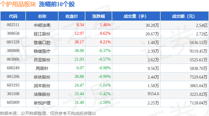 证券之星消息,12月26日个护用品板块较上一交易日下跌0.44%,倍加洁领跌。当日上证指数报收于 3963.68,上涨0.1%。深证成指报收于13603.89,上涨0.54%。个护用品板块个股涨跌见下表: | 代码 | 名称 | 主力净流入(元) | 主力净占比 游资净流入 (元) | | 游资净占比 散户净流入(元) | | 散户净占比 | | --- | --- | --- | --- | --- | --- | --- | --- | | 300658 延江股份 | | 532.94万 | 1.96% | -230.96万 | -0.85% | -301.98万 | -1.11% | | 603193 润本股份 | | 97.63万 | 2.53% | -250.99万 | -6.49% | 153.36万 | 3.97% | | 003006 自亚股份 | | -2.02万 | -0.04% | 236.22万 | 4.28% | -234.20万 | -4.24% | | 301009 可靠股份 | | -203.68万 | -4.39% | -294.73万 | -6.35% | 498.41万 ...