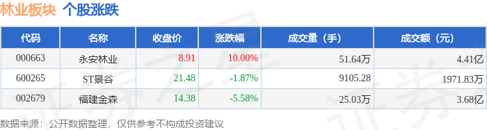 | 代码 | 名称 | 收盘价 | 涨跌幅 | 成交量(手) | 成交额(元) | | | --- | --- | --- | --- | --- | --- | --- | | 000663 | 永安林业 | 8.91 | 10.00% | 51.64万 | | 4.41亿 | | 600265 | ST景谷 | 21.48 | -1.87% | 9105.28 | | 1971.83万 | | 002679 | 福建金森 | 14.38 | -5.58% | 25.03万 | | 3.68亿 | 证券之星消息,11月19日林业板块较上一交易日下跌0.02%,福建金森领跌。当日上证指数报收于 3946.74,上涨0.18%。深证成指报收于13080.09,下跌0.0%。林业板块个股涨跌见下表: | 代码 | 名称 | | | 主力净流入(元) 主力净占比 游资净流入(元) 游资净占比 散户净流入 (元) 散户净占比 | | | | | --- | --- | --- | --- | --- | --- | --- | --- | | 000663 永安林业 | | 1.45亿 | 32.84% | -704 ...