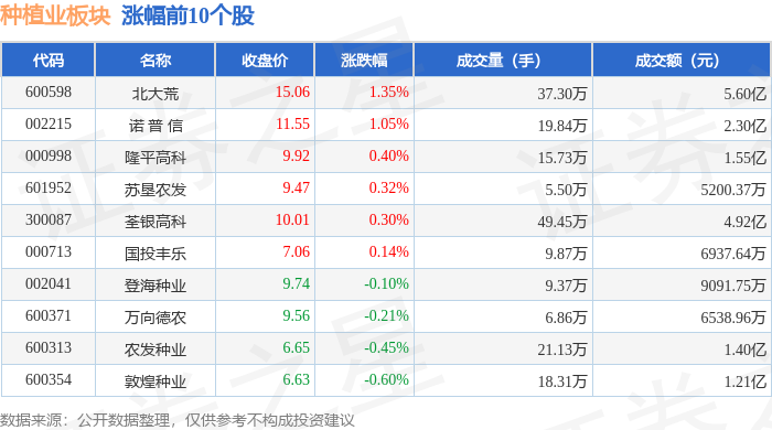 证券之星消息,11月19日种植业板块较上一交易日下跌0.54%,海南橡胶领跌。当日上证指数报收于 3946.74,上涨0.18%。深证成指报收于13080.09,下跌0.0%。种植业板块个股涨跌见下表: | 代码 | 名称 | 收盘价 | 涨跌幅 | 成交量(手) | 成交额(元) | | --- | --- | --- | --- | --- | --- | | 601118 | 海南橡胶 | 5.90 | -3.28% | 69.78万 | 4.13亿 | | 300189 | 神农种业 | 5.62 | -2.77% | 205.12万 | 11.49亿 | | 920087 | 秋乐种业 | 16.00 | -2.74% | 5.24万 | 8445.00万 | | 600883 | 博闻科技 | 8.72 | -2.02% | 1 3.79万 | 3323.95万 | | 603336 | 宏辉果疏 | 9.57 | -1.85% | 10.28万 | 9899.11万 | | 300511 | 雪榕生物 | 7.14 | -1.79% | 18.14万 | 1.30亿 | | 300970 | 华 ...
