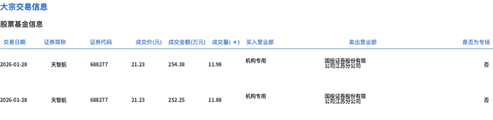 1月28日,天智航大宗交易成交23.86万股,成交额506.63万元,占当日总成交额的1.44%,成交价21.23 元,较市场收盘价23.23元折价8.61%。 | 交易日期 | 证券简称 | 证券代码 | 成交价(元) 成交金额(万元) 成交量( *) 买入营业部 | | | | | 类出营业部 | 是否为专场 | | | --- | --- | --- | --- | --- | --- | --- | --- | --- | --- | --- | | 2026-01-28 | 天智航 | 688277 | 21.23 | 254.38 | 11.98 | 机构专用 | 圆筒连续男公费气 | | | Ka | | 2026-01-28 | 天智航 | 688277 | 21.23 | 252-25 | 11.88 | 机构专用 | 圆鹤至卖劈纹高气 | | | Ka | ...