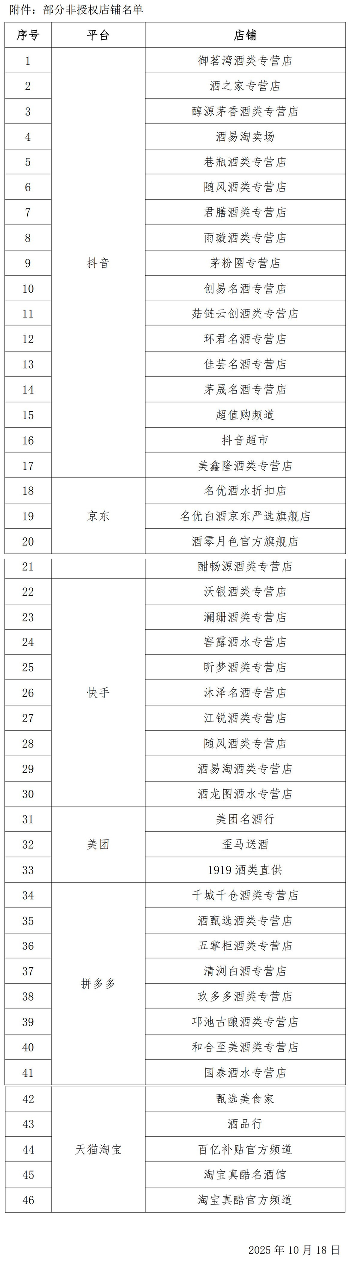 Core Points - Wuliangye has issued a notice to consumers regarding unauthorized stores selling its products on various e-commerce platforms ahead of the "Double Eleven" shopping festival [1] - The company identified 46 unauthorized stores across platforms such as Douyin, JD, Kuaishou, Meituan, Pinduoduo, and Tmall Taobao [1] - Wuliangye has previously issued similar notices, with this being the third such announcement since the beginning of 2024, indicating a more direct approach by exposing specific unauthorized stores [4][5] Summary by Category Unauthorized Stores - Wuliangye's notice lists 46 unauthorized stores, including 17 on Douyin, 4 on JD, 9 on Kuaishou, 3 on Meituan, 8 on Pinduoduo, and 5 on Tmall Taobao [1] - The company emphasizes the risks associated with purchasing from these unauthorized channels, including issues with product authenticity, quality assurance, lack of official after-sales service, and difficulties in protecting consumer rights [4] Consumer Protection Measures - Wuliangye has provided free product authentication services, having authenticated 1,610 bottles from January to May 2024, with 268 bottles identified as counterfeit, representing 16.65% of the total [5] - The company has also worked with e-commerce platforms to shut down 261 counterfeit stores and remove 6,431 infringing links since November 2024 [5] Authorized Sales Channels - Wuliangye has updated its list of authorized e-commerce sales channels, now exceeding 50 stores, including official self-operated stores and those on platforms like JD, Tmall, and Douyin [5] - The latest authorized channels include 17 official self-operated stores, 11 on JD, 10 on Tmall, and 7 on Douyin, along with other retail platforms [5]