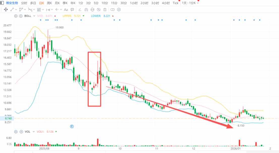 自去年8月8日盘中触及19.90港元阶段性高点后,博安生物(06955)的股价便开启了一轮长达5个多月的下跌行情。今年1月5日盘中,博安生物股价触及年内新 低8.15港元,让这段下跌行情的股价高低振幅达到59.05%。 智通财经APP观察到,得益于去年上半年的上涨行情,即使在去年年末市值仅剩53.12亿港元的情况下,博安生物依旧凭借其2025年第二期港股通检讨期内 的65.65亿港元日均市值,在当时港股通调出门槛60.26亿港元上顺利卡位,实现成功"保通"。 然而,这根大阳线并未提振市场情绪,在接下来的行情中,技术面上,博安生物的BOLL线出现了明显的收窄趋势,引导股价持续震荡下跌,而公司股价也 基本沿BOLL线中下轨作机械震荡,且整体走势呈现出无量空跌状态。在这段长达4个月的持续低价行情中,威美控股甚至仅有4个交易日的日成交量超过 1000万股,市场交投情绪较此前明显更加低迷。 即使在去年11月27日出现了一波冲击BOLL线上轨的走势,但均未观察到明显的成交量放大支持,也没有形成有效实体K线突破,在技术面上属于典型的 BOLL线指标"假突破",后续公司股价依旧震荡下跌至今年1月2日的盘中低点。 结合量能来看 ...