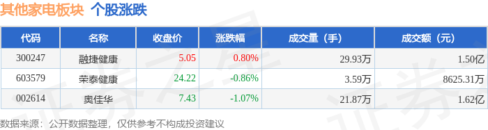 从资金流向上来看,当日服装家纺板块主力资金净流出1.64亿元,游资资金净流出4720.07万元,散户资 金净流入2.11亿元。服装家纺板块个股资金流向见下表: 证券之星消息,11月28日服装家纺板块较上一交易日上涨1.05%,奥康国际领涨。当日上证指数报收于 3888.6,上涨0.34%。深证成指报收于12984.08,上涨0.85%。服装家纺板块个股涨跌见下表: | 代码 | 名称 | 收盘价 | 涨跌幅 | 成交量(手) | 成交额(元) | | | --- | --- | --- | --- | --- | --- | --- | | 603001 | 奧康国际 | 10.00 | 9.41% | 18.24万 | | 1.77亿 | | 300005 | 探路者 | 11.73 | 5.96% | 68.38万 | | 7.94亿 | | 603557 | ST起步 | 2.63 | 5.20% | 0 9.04万 | | 2338.08万 | | 002397 | 梦洁股份 | 4.37 | 5.05% | 53.05万 | | 2.29亿 | | 601566 | 九牧王 | 13.42 | 4. ...