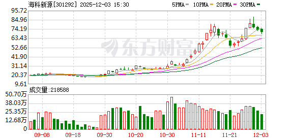 融资融券数据显示,该股最新(12月2日)两融余额为2.72亿元,其中,融资余额为2.72亿元,本期筹码 集中以来融资余额合计减少604.80万元,降幅为2.18%。 公司发布的三季报数据显示,前三季公司共实现营业收入36.53亿元,同比增长43.17%,实现净利 润-1.28亿元,同比增长40.06%,基本每股收益为-0.5700元。(数据宝) 海科新源12月3日披露,截至11月30日公司股东户数为33029户,较上期(11月20日)减少2575户,环比 降幅为7.23%。 证券时报·数据宝统计,截至发稿,海科新源收盘价为70.50元,下跌3.09%,本期筹码集中以来股价累 计上涨10.61%。具体到各交易日,5次上涨,4次下跌,其中,涨停1次。 ...