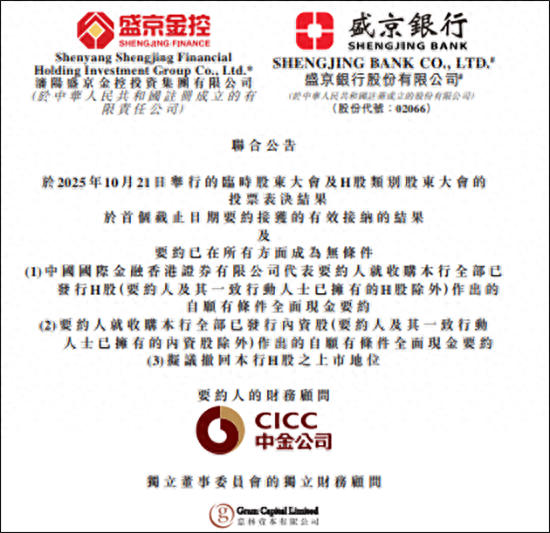 Core Viewpoint - Shengjing Bank has announced its decision to voluntarily withdraw its H-share listing status from the Hong Kong Stock Exchange, with over 99.99% approval from shareholders, marking the initiation of the delisting process [1][3]. Delisting Process - The formal delisting from the Hong Kong Stock Exchange is scheduled for November 20, 2025, with the last trading day for H-shares set for November 13, 2025 [3][4]. Shareholder Acceptance - As of October 21, 2025, approximately 2.241 billion H-shares have accepted the offer, representing about 99.69% of independent H-share holders, 95.74% of issued H-shares, and 25.48% of all issued shares [4][5]. Offer Details - The delisting will be executed through a full cash offer by the largest shareholder, Shenyang Shengjing Financial Holdings Group, with the final H-share offer price set at HKD 1.60 per share, a premium of approximately 40.35% over the last closing price of HKD 1.14 [5][6]. Financial Overview - Shengjing Bank reported a total of approximately 8.797 billion shares issued, with H-shares accounting for about 2.341 billion and domestic shares for about 6.456 billion. The closing share price on the announcement day was HKD 1.58 [6][7]. Performance Metrics - For the first half of 2025, Shengjing Bank achieved a revenue of RMB 4.326 billion and a net profit of RMB 508 million, with total assets amounting to RMB 11,281.81 billion [6][7]. Risk Management - The bank's non-performing loan ratio stands at 2.69%, with a provision coverage ratio of 157.00% [7].