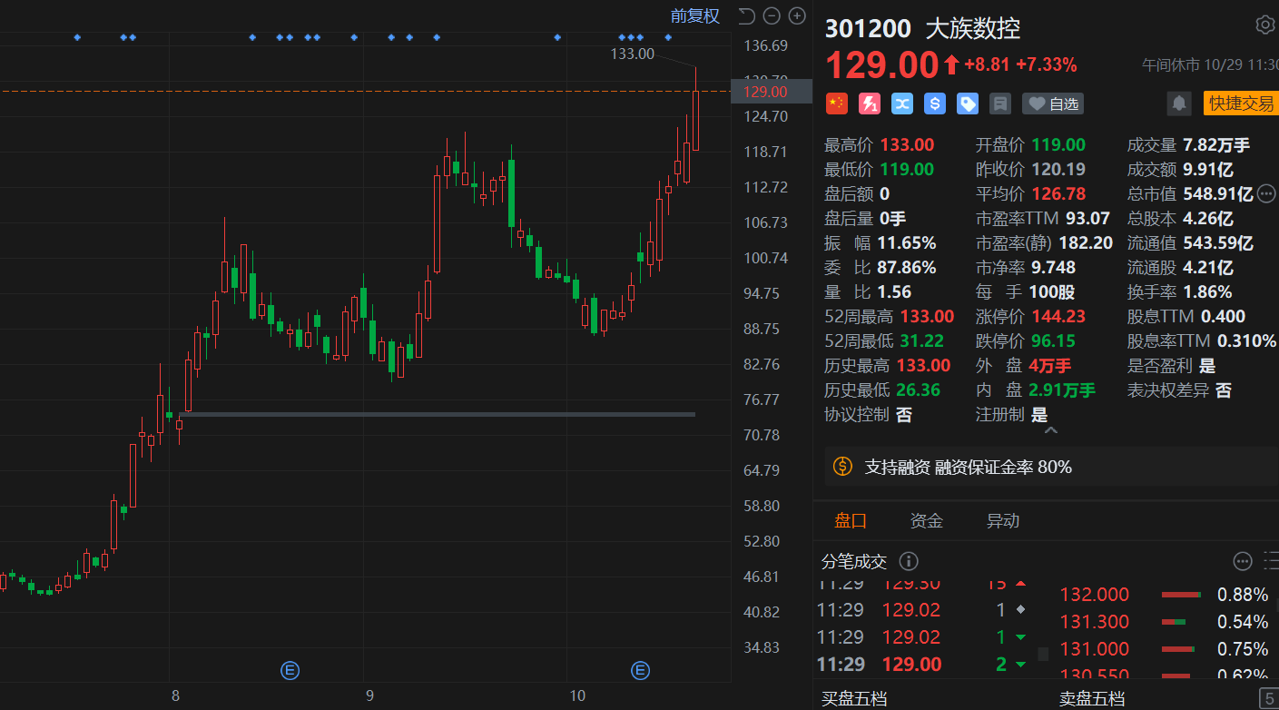 在第三季度尤为迅猛。单季实现营业收入15.21亿元,同比增长95.19%;归属于上市公司股东的净利润为2.28亿元,同比大幅增长281.94%,扣除非经常性损 益后的净利润更是实现了406.06%的惊人增幅。业绩的强劲增长主要受益于AI服务器相关的高多层板需求持续旺盛,以及公司创新设备的销售规模不断扩 大。 格隆汇10月29日|大族激光(002008.SZ)继续上涨行情,午间收涨超7%,并且录得7连涨行情,高见133元刷新上市新高价,总市值548.9亿元。 消息上,大族激光日前披露了2025年第三季度报告,报告期内公司成功实现跨越式增长,前三季度营业收入达39.03亿元,同比增长66.53%;归属于上市公 司股东的净利润高达4.92亿元,同比激增142.19%。 ...