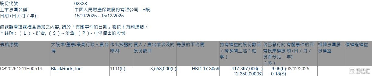 | 股份代號: | 02328 | | --- | --- | | 上市法國名稱: | 中國人民財產保險股份有限公司 - H股 | | 日期 (日 / 月 / 年): | 15/11/2025 - 15/12/2025 | | FREE FREE | 大股東/董事/最高行政人員名 作出披露的買入 / 賣出或涉及的 每股的平均價 | | 持有權益的股份數目 佔已發行的有關事件的日 相關法團 | | | --- | --- | --- | --- | --- | | | 股份數目 | | ( 請参関上述 * 註 有投票權股期 (日 / 月 / 份百分比 年) | | | CS20251211E00514 | 3,558,000(L) BlackRock, Inc. 1101(L) | HKD 17.3059 | 417,397,006(L) | 6.05(L)08/12/2025 | | | | | 12,350,000(S) 0.18(S) | | 格隆汇12月15日丨根据联交所最新权益披露资料显示,2025年12月8日,中国财险(02328.HK)获BlackRock, Inc.在场内以每股均价17.3059 ...