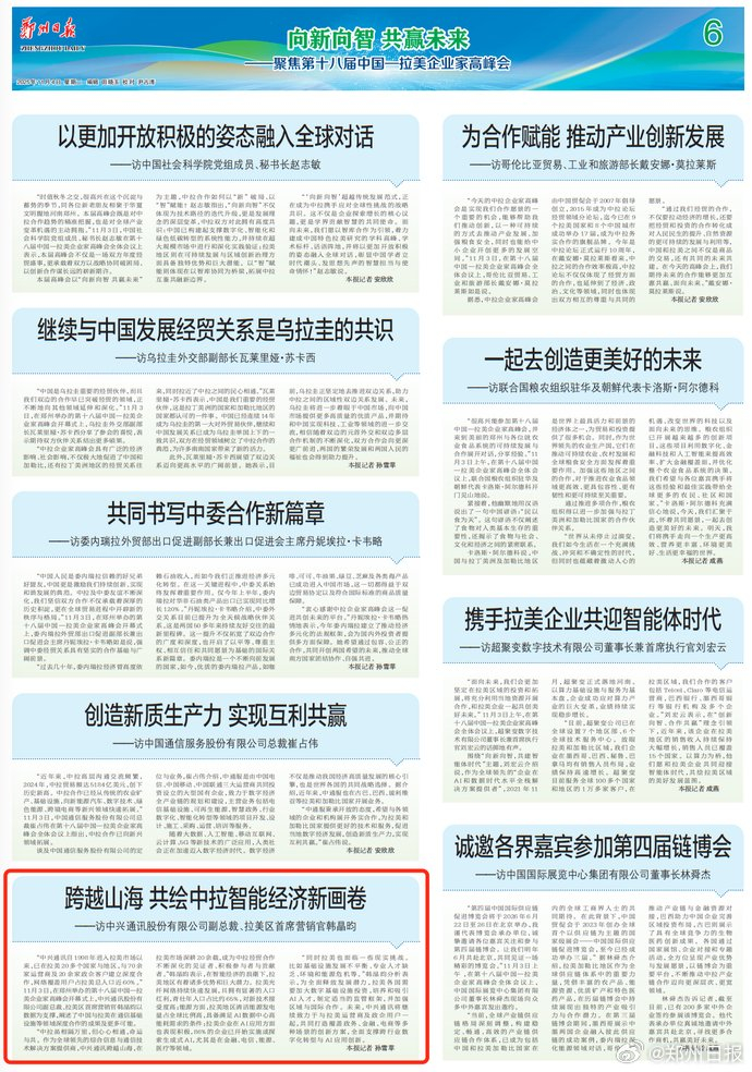 【#中拉企业家高峰会在郑州开幕# 韩晶昀:跨越山海 共绘中拉智能经济新画卷】"中兴通讯自1998年进 入拉美市场以来,已在拉美20多个国家与地区,与70余家运营商及20余家政企客户建立深度合作,网络 覆盖用户占拉美总人口近60%。"11月3日,在郑州举办的第十八届中国—拉美企业家高峰会开幕式上, 中兴通讯股份有限公司副总裁、拉美区首席营销官韩晶昀以数据为支撑,阐述了中国与拉美在通信基础 设施等领域深度合作的成果及更多可能。 "中拉虽相隔万里,但心心相通,命运与共。作为全球领先的综合信息与通信技术解决方案提供商,中 兴通讯跨越山海,在拉美市场深耕20余载,成为中拉经贸合作不断深化的见证者、积极参与者与贡献 者。"韩晶昀表示,在智能经济的浪潮下,拉美地区有着诸多优势和巨大潜力。拉美光纤网络持续快速 发展,且拥有显著的人口红利,青壮年人口占比约65%,对新技术接受度高;能源方面,拉美地区清洁 能源发电量占全球比例高,具备满足AI数据中心高能耗需求的条件;拉美企业在AI应用方面也表现积 极,86%的企业已开始实施或探索生成式AI,尤其是在金融、电信、能源、医疗等领域。 "同时拉美也面临一些现实挑战。比如基础设施发展不 ...