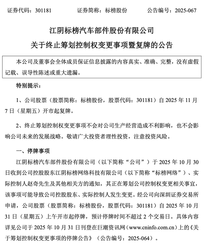 11月6日晚间,标榜股份公告,公司控股股东标榜网络、实控人赵奇及其他相关方决定终止控制权变更 事项。公司目前各项经营情况正常,终止筹划本次控制权变更事项不会对公司经营业绩和财务状况产生 重大不利影响,公司股票自2025年11月7日(星期五)上午开市起复牌。 根据公告,本次筹划控制权变更事项终止原因为:公司控股股东标榜网络、实际控制人赵奇先生及其他 相关方与交易对方就某些核心条款未能达成一致意见,在认真听取各方意见并与交易对方协商一致后, 为切实维护公司全体股东及公司利益,本着审慎的原则,决定终止本次控制权变更事项。 公告称,相关交易方未就本次交易具体方案最终签署实质性协议,对终止本次交易无需承担违约责任。 公司目前各项经营情况正常,终止筹划本次控制权变更事项不会对公司经营业绩和财务状况产生重大不 利影响。 编辑|钉钉 标榜股份于10月31日起停牌,截至10月30日收盘,该股涨1.47%,报51.2元。 ...