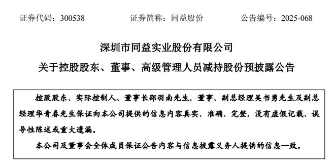 本次减持计划实施不会导致公司控制权发生变更、不会对公司治理结构及持续经营产生影响。 公司不存在破发、破净情形或者最近三年未进行现金分红、累积现金分红金额低于最近三年年均净利润 30%的情形。 来源:金综科技 12月19日,同益股份(300538.SZ)公告,公司控股股东、实际控制人、董事长邵羽南先生,董事、副总 经理吴书勇先生及副总经理华青春先生拟减持股份数量合计不超过542.41万股(含本数),即不超过公司 总股本的3.00%。 本次减持股东将结合市场情况、公司股价情况等情形决定是否实施本次股份减持计划,本次减持计划存 在减持时间、数量、价格的不确定性,也存在是否按期实施完成的不确定性。 特别声明:以上内容仅代表作者本人的观点或立场,不代表新浪财经头条的观点或立场。如因作品内 容、版权或其他问题需要与新浪财经头条联系的,请于上述内容发布后的30天内进行。 ...