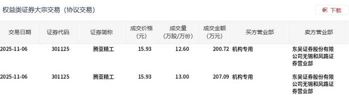 11月6日,腾亚精工大宗交易成交25.6万股,成交额407.81万元,占当日总成交额的5.24%,成交价15.93 元,较市场收盘价19.45元折价18.1%。 | 交易日期 | 证券代码 | 证券简称 | 成交价格 | 成交量 | 成交金额 | 买方营业部 | 卖方营业部 | | --- | --- | --- | --- | --- | --- | --- | --- | | | | | (元) | (万股/万份) | (万元) | | | | 2025-11-06 | 301125 | 腾亚精工 | 15.93 | 12.60 | 200.72 机构专用 | | 东吴证券股份有限 | | | | | | | | | 公司无锡和风路证 | | | | | | | | | 劳营业部 | | 2025-11-06 | 301125 | 腾亚精工 | 15.93 | 13.00 | 207.09 机构专用 | | 东吴证券股份有限 | | | | | | | | | 公司无锡和风路证 | | | | | | | | | 穿雪亚部 | ...