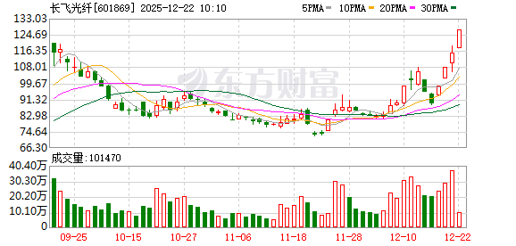 长飞光纤股价创出历史新高,截至9:32,该股上涨4.59%,股价报120.80元,成交量260.78万股,成交金 额3.12亿元,换手率0.64%,该股最新A股总市值达490.86亿元,该股A股流通市值490.86亿元。 两融数据显示,该股最新(12月19日)两融余额为11.42亿元,其中,融资余额为11.34亿元,近10日增 加2.15亿元,环比增长23.42%。 公司发布的三季报数据显示,前三季度公司共实现营业收入102.75亿元,同比增长18.18%,实现净利润 4.70亿元,同比下降18.02%,基本每股收益为0.6200元,加权平均净资产收益率3.98%。(数据宝) (文章来源:证券时报网) 证券时报·数据宝统计显示,长飞光纤所属的通信行业,目前整体涨幅为2.31%,行业内,目前股价上涨 的有94只,涨幅居前的有长芯博创、特发信息、亨通光电等,涨幅分别为11.09%、9.01%、6.48%。股 价下跌的有25只,跌幅居前的有鼎信通讯、三维通信、中富通等,跌幅分别为4.84%、2.92%、2.45%。 ...
