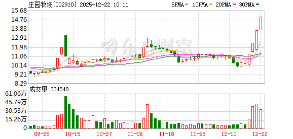 庄园牧场盘中涨停,已连收4个涨停板,截至9:36,该股报15.02元,换手率19.19%,成交量3282.12万 股,成交金额4.81亿元,涨停板封单金额为5.37亿元。连续涨停期间,该股累计上涨46.54%,累计换手 率为77.33%。最新A股总市值达29.37亿元,A股流通市值25.69亿元。 龙虎榜数据显示,该股因连续三个交易日内,涨幅偏离值累计达20%、日振幅值达15%上榜龙虎榜2 次,买卖居前营业部中,机构净卖出1219.48万元,营业部席位合计净卖出270.97万元。 据天眼查APP显示,兰州庄园牧场股份有限公司成立于2000年04月25日,注册资本19553.9347万人民 币。(数据宝) 近日该股表现 | 日期 | 当日涨跌幅(%) | 换手率(%) | 主力资金净流入(万元) | | --- | --- | --- | --- | | 2025.12.19 | 9.99 | 25.09 | 4824.16 | | 2025.12.18 | 10.02 | 22.88 | 6296.89 | | 2025.12.17 | 10.05 | 10.17 | 3717.78 | | 2025.12. ...