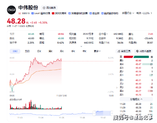 公告显示,中伟股份此次H股发行的价格区间初步确定为34港元至37.8港元,按汇率1港元≈0.92元人民 币换算,A股最新价比H股发行价上下限分别溢价27.7%-35.02%。 | 中伟股份 | | | 1 添加自选 | | | | | | | | | | | | --- | --- | --- | --- | --- | --- | --- | --- | --- | --- | --- | --- | --- | --- | | S2 300919 Level Level Laudit Mark Child Card Child Card Child Card Child Card Child Card Child Card Comments of | | | | | | | | | | | | 所属行业 ▼ 电池 +223% > | | | 48.28 +2.45 +5.35% 休市 11-07 11:30:00 北京时间 | | | | | | | | | | | | | | | 今开 | 45.65 | 時間 | | 48.86 | 成交量 | 20.57万手 | | 总市值, | | 452.88 ...