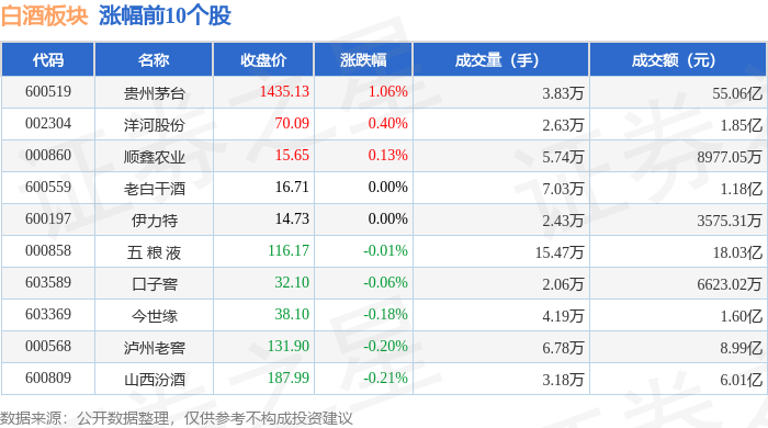 证券之星消息,11月6日白酒板块较上一交易日上涨0.54%,贵州茅台领涨。当日上证指数报收于4007.76,上涨0.97%。深证成指报收于 13452.42,上涨1.73%。白酒板块个股涨跌见下表: | 代码 | 名称 | 收盘价 | 涨跌幅 | 成交量(手) | 成交额(元) | | | --- | --- | --- | --- | --- | --- | --- | | 600519 | 贵州茅台 | 1435.13 | 1.06% | 3.83万 | | 55.06亿 | | 002304 | 洋河股份 | 70.09 | 0.40% | 2.63万 | | 1.85亿 | | 000860 | 顺鑫农业 | 15.65 | 0.13% | 5.74万 | | 8977.05万 | | 600559 | 老白干酒 | 16.71 | 0.00% | 7.03万 | | 1.18亿 | | 600197 | 伊力特 | 14.73 | 0.00% | 2.43万 | | 3575.31万 | | 000858 | 五粮液 | 116.17 | -0.01% | 15.47万 | | 18.03亿 | | ...