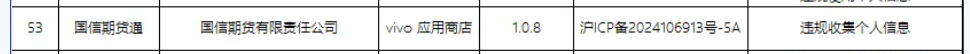 | 62 | 申万宏源 | 申万宏源证券有限公司 | 小米应用商店 | 1.3.81 | 沪ICP备16027679号-7A | 费器共和关 | | --- | --- | --- | --- | --- | --- | --- | | 63 申万宏源证券 | | 申万宏源证券有限公司 | vivo 应用商店 | 6.0.6 | 沪ICP备16027679号-8A | 账号注销难 | 国信证券(002736.SZ)年报显示,国信期货有限责任公司为国信证券100%持股的子公司。 中国经济网北京12月23日讯 上海市通信管理局11月26日发布消息"上海市通信管理局关于侵害用户权益行为APP(SDK)的通报 (2025年第十批)"。近期,上海市通信管理局组织第三方检测机构对我市APP(SDK)进行抽查,共发现71款APP(SDK)存在侵害用 户权益行为。 其中,ICP备案主体为国信期货有限责任公司的国信期货通(版本号1.0.8)所涉问题为违规收集个人信息。 | | | | FURNE F W LAND TH T T S | | --- | --- | --- | --- | | 53 国信期货通 | 国信期货有限责 ...